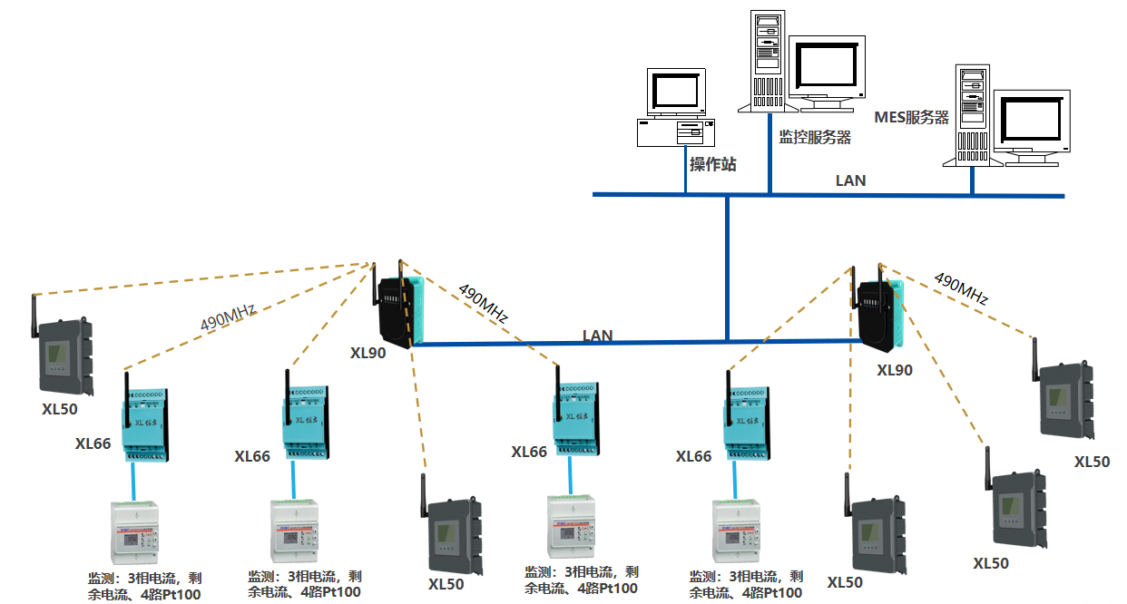 4、所有采集的數(shù)據(jù)通過無線Lora上傳給物聯(lián)網(wǎng)關(guān)XL90,然后網(wǎng)關(guān)通過以太網(wǎng)或者WIFI(5G)把數(shù)據(jù)傳給MES系統(tǒng)。