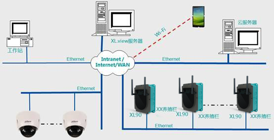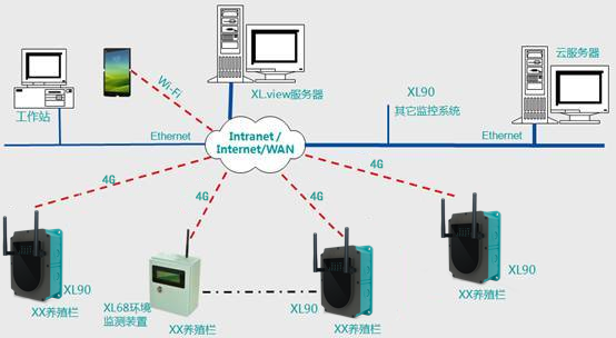 智慧養(yǎng)殖環(huán)境監(jiān)控系統(tǒng)基于傳統(tǒng)服務(wù)器或云服務(wù)器平臺和XL.SN智能傳感網(wǎng)絡(luò)技術(shù)(Lora、433M、4G、NB-IOT等),采用物聯(lián)網(wǎng)關(guān)、智能環(huán)境監(jiān)測終端、無線采集裝置、智能傳感器等,實(shí)現(xiàn)對空氣溫濕度、光照度、CO?濃度、硫化氫、氨氣、溶氧量、PH值、水溫、銨氮等養(yǎng)殖場環(huán)境參數(shù)的實(shí)時采集、無線傳輸、監(jiān)測和控制。