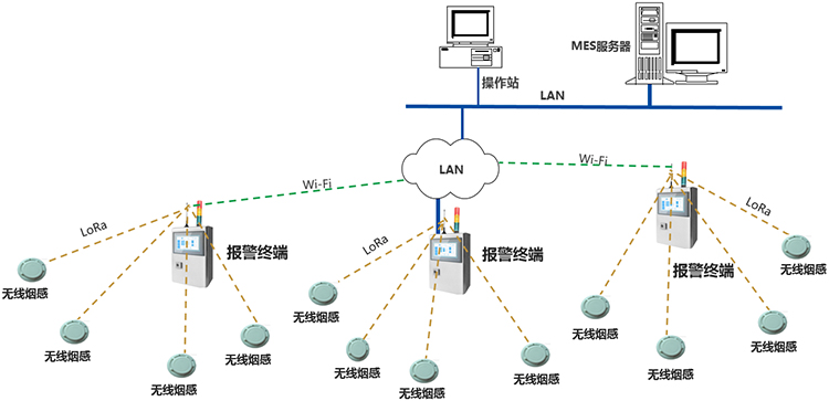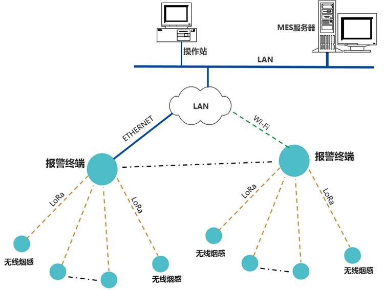 報警終端通過無線,獲取管轄區域內,煙感監測點的數據,通過ETHERNET,或Wi-Fi,推送數據至工廠MES服務器,通信協議為工廠MQTT數據格式。