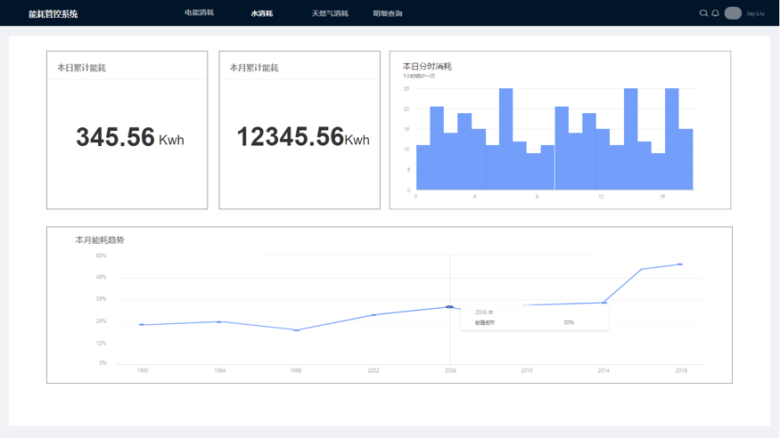 能源數(shù)據(jù)服務(wù)器,聯(lián)接到展示廳能耗看板,在大屏上更直觀的顯示能耗數(shù)據(jù),如本日累計(jì)消耗,本月累計(jì)消耗,柱狀圖用來顯示本日每一小時(shí)的消耗量,曲線圖顯示本月每天能耗變化的情況。效果示意圖如下: