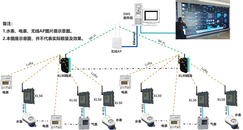 物聯(lián)網(wǎng)關(guān)通過LoRa無線讀取水、電、氣等表計(jì)的數(shù)據(jù),通過Wi-Fi推送數(shù)據(jù)至EMS(能源管理)服務(wù)器,無線AP起到橋梁作用。無線AP通過以太網(wǎng)接口,直接聯(lián)接EMS服務(wù)器。