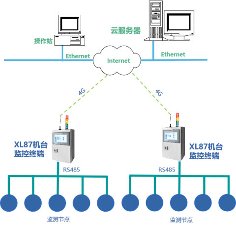 采集終端的數據通過RS485將數據傳輸至XL87監控終端,XL87監控終端通過4G通信將環境數據上傳至云平臺,平臺軟件可向操作站、監控看板、現場監控觸摸屏推送數據。