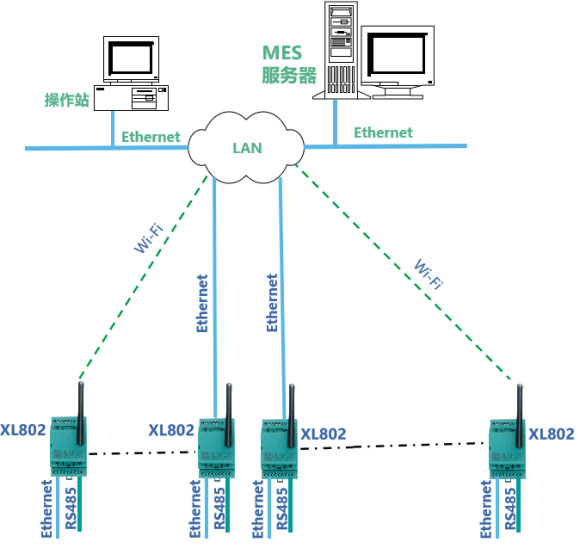 ? XL802 通信主機通過 Ethernet 或 Wi-Fi ,接入 LAN ,連接 MES 服務(wù)器。