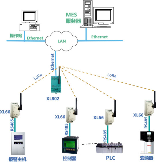 XL66無線轉(zhuǎn)換器通過RS485/RS232接口讀取設(shè)備數(shù)據(jù),設(shè)計XL802通信主機安裝在LAN口附近接入局域網(wǎng),并通過LoRa無線接口,從XL66無線讀取設(shè)備的運行數(shù)據(jù),通信協(xié)議轉(zhuǎn)換處理后,通過Ethernet,轉(zhuǎn)發(fā)數(shù)據(jù)至MES。