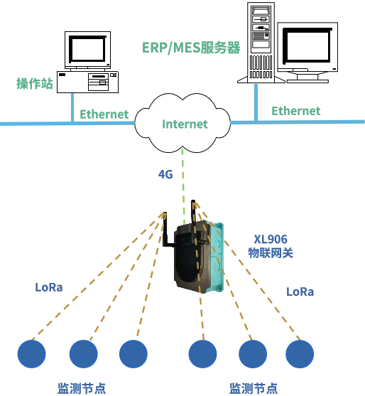 XL906物聯(lián)網(wǎng)關(guān),無線讀取監(jiān)測節(jié)點的數(shù)據(jù),進行處理、協(xié)議轉(zhuǎn)換,通過以太網(wǎng)(Ethernet)或Wi-Fi,轉(zhuǎn)發(fā)數(shù)據(jù)至MES、ERP、EMS等多個工廠數(shù)字化平臺,實現(xiàn)數(shù)據(jù)聯(lián)網(wǎng)、集中監(jiān)控分析。