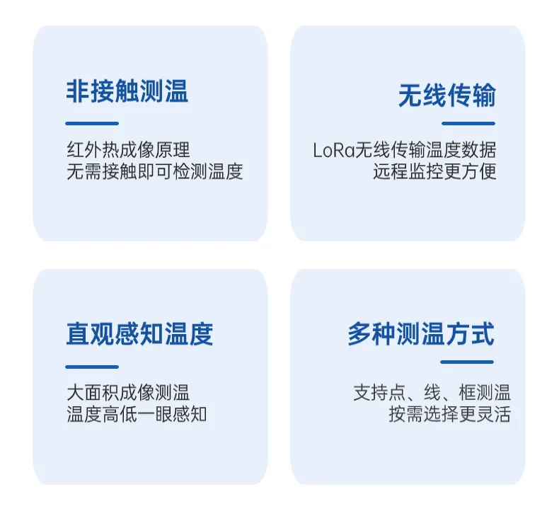 采用XL16IT無線紅外熱成像測溫傳感器,實現對配電柜、變壓器等電氣設備母線、銅排、電纜連接部位的非接觸式溫度監測。配置氧化釩非制冷型探測元件,可同時監測10個點、10個框、1條線的溫度,測溫范圍廣、精度高。