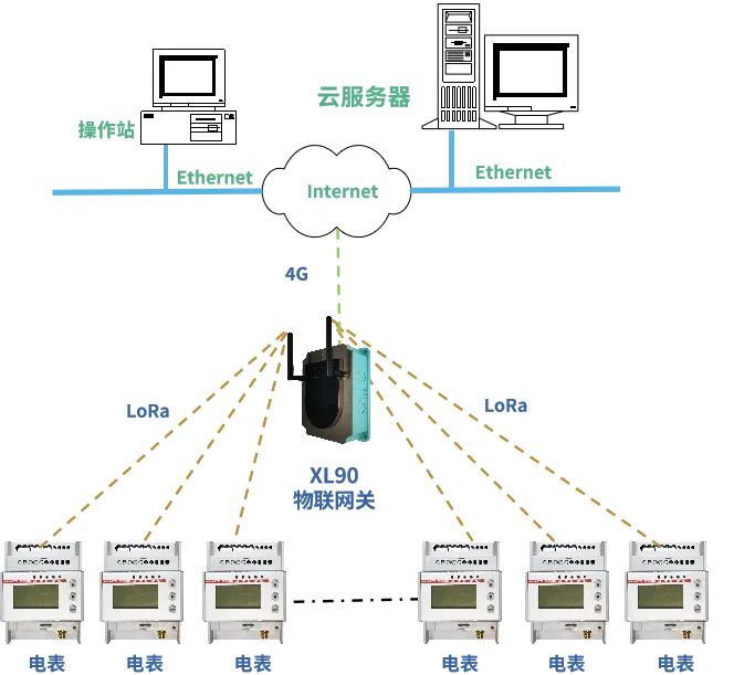 DTSD3366XL無線多功能電表獲取數據,通過LoRa無線傳輸方式上傳至XL90網關;XL90網關計算分析讀取的能耗數據,并通過4G無線通信方式,將數據上傳至監控平臺。
