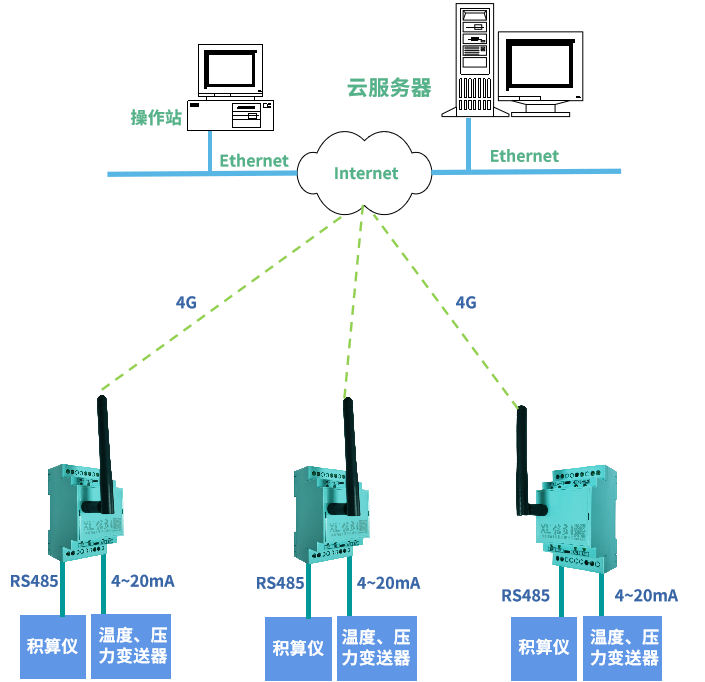 管網上已安裝的流量計、積算儀、壓力變送器、溫度變送器等儀表,由于廠家不同,通信接口可能不統一,選擇XL802通信主機,搭配XLAI模擬量輸入模塊,可同時讀取儀表4~20mA、RS485通信接口的信號,將管道壓力、溫度、瞬時流量、累積流量等關鍵數據,無線遠傳至監控平臺。