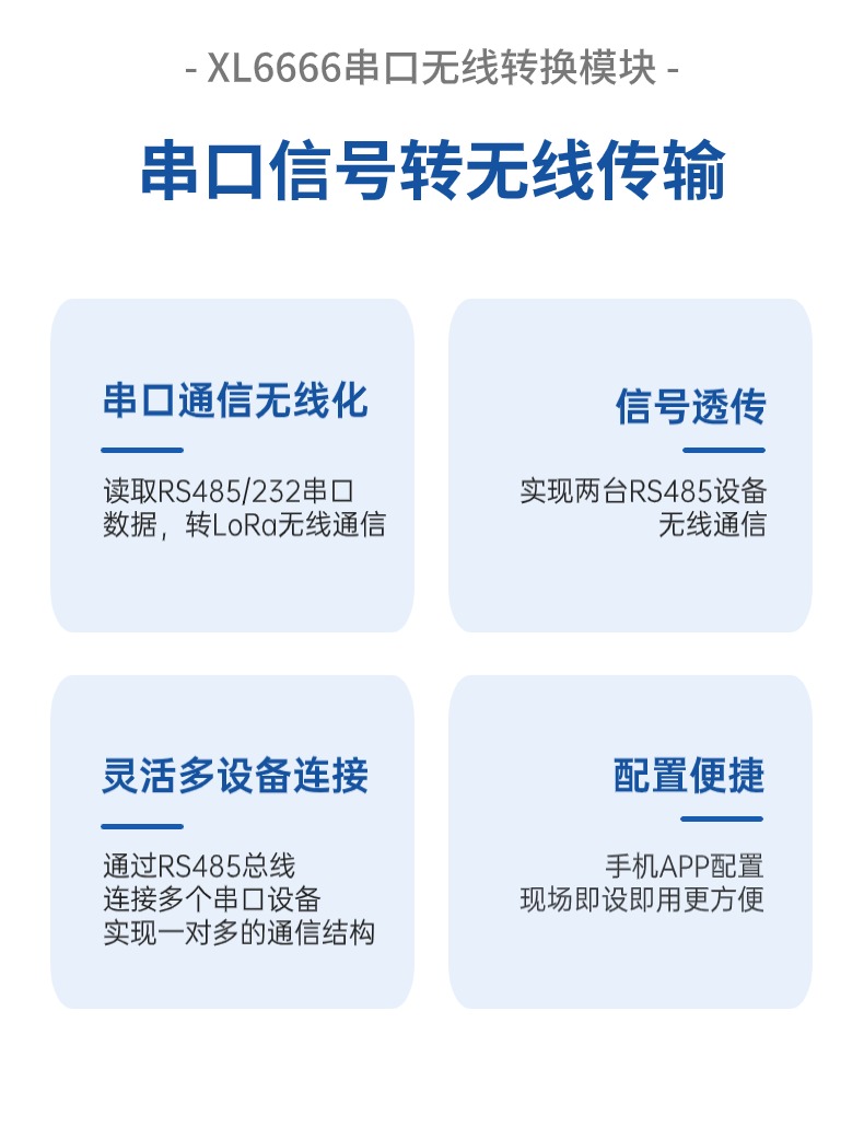 選擇XL6666串口無線轉換模塊,通過RS485通信口讀取流量計數據,并通過 LoRa 無線傳輸至中控室。